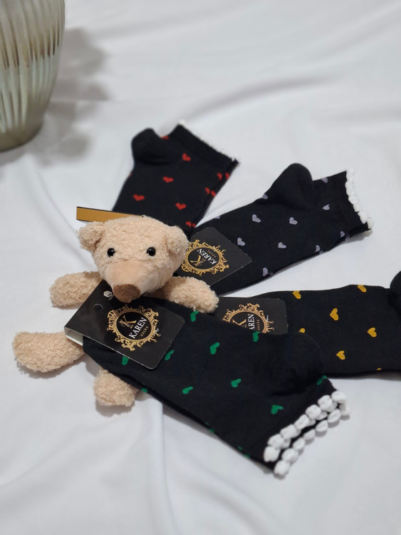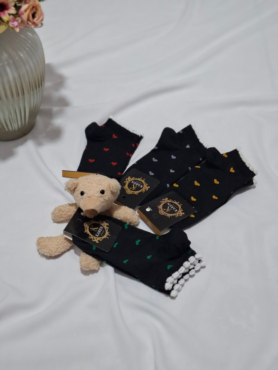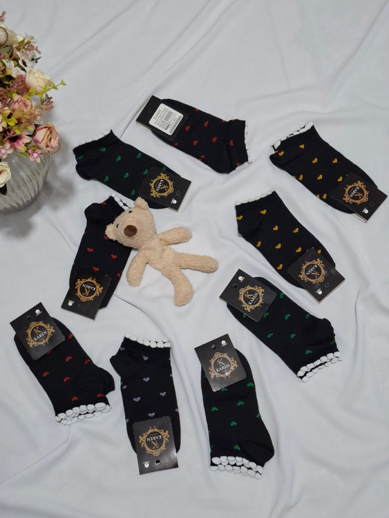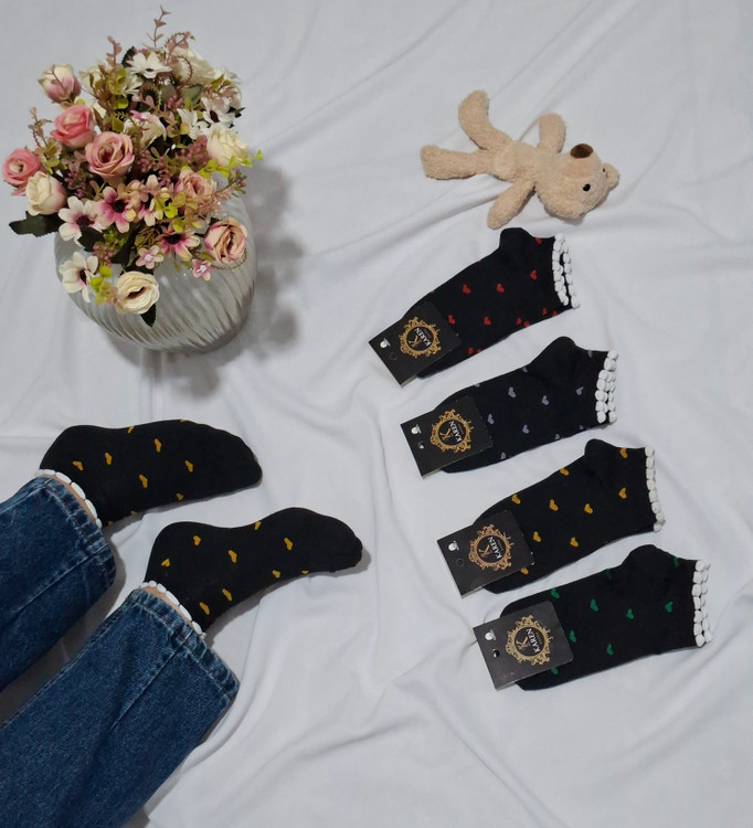 جوراب زنانه مچی طرح مشکی قلبی لب کنگره ای نخ ایرانی عمده 12جفتی کد:۱۱۶