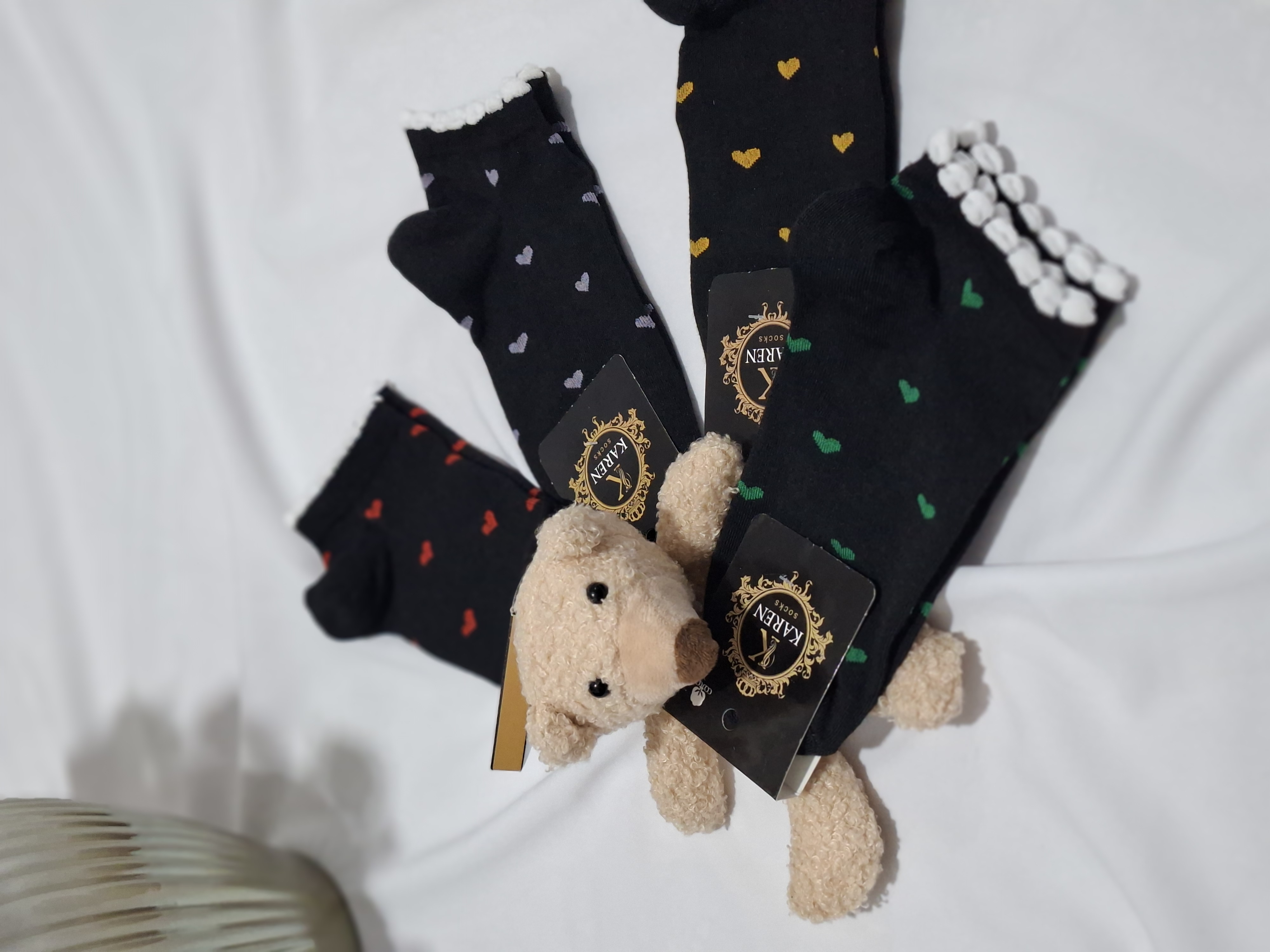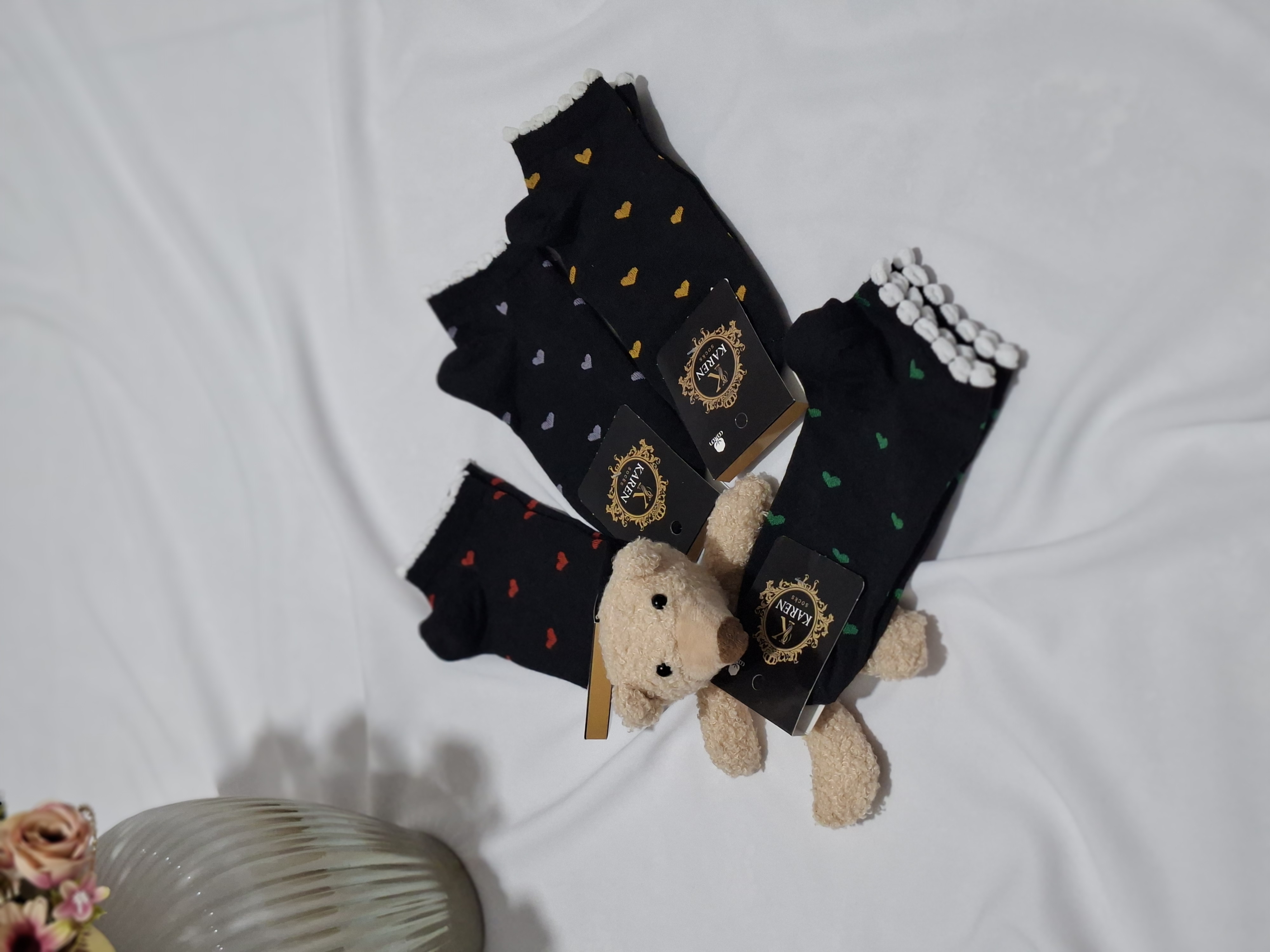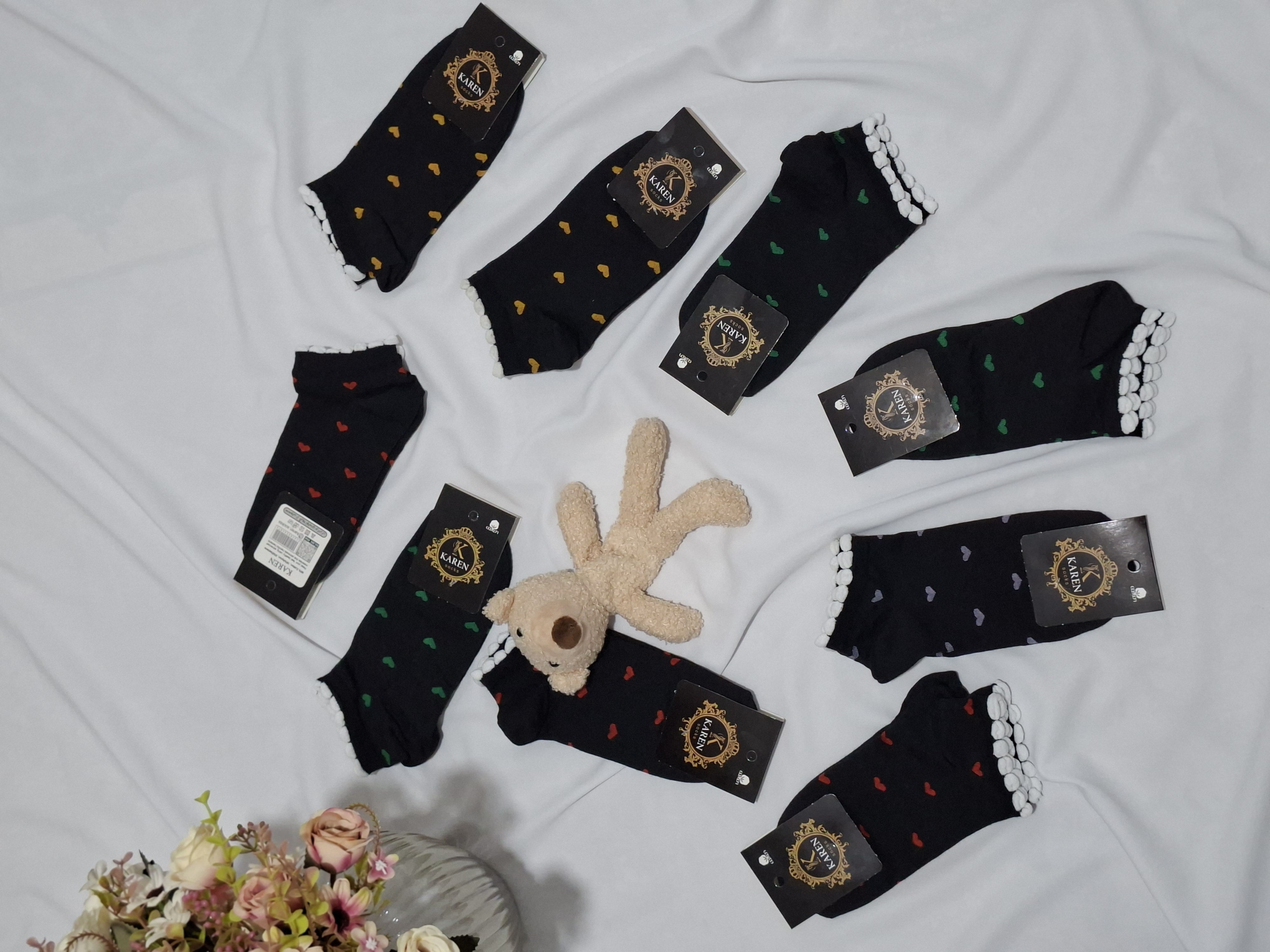 جوراب زنانه مچی طرح مشکی قلبی لب کنگره ای نخ ایرانی عمده 12جفتی کد:۱۱۶